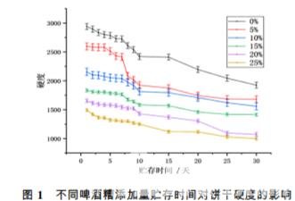 由圖 1 可知,啤酒糟添加量為 10% 、15% 、20% 、 25% 的餅干的硬度變化趨勢明顯低于未添加啤酒糟的餅干。另外,未加啤酒糟的餅干硬度在貯存過程中 下降幅度較大,而添加啤酒糟的餅干硬度在貯存過程 中下降幅度相對(duì)較小,而且隨著啤酒糟加量增加,貯 存過程下降幅度也有縮小的趨勢。