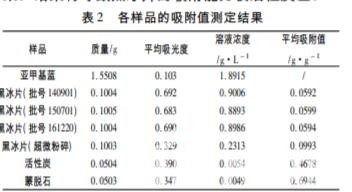 各樣品吸附值結(jié)果見表 2。 結(jié)果顯示,黑冰片對(duì)亞甲基藍(lán)有一定的吸附作用,不 同生產(chǎn)批次的同等質(zhì)量的黑冰片吸附能力差異不 大,說明生產(chǎn)廠家生產(chǎn)的黑冰片質(zhì)量穩(wěn)定。比較不 同粒徑黑冰片吸附能力可知,黑冰片顆粒粒徑越小, 吸附能力越強(qiáng)。比較相同質(zhì)量的各種吸附劑的吸附 能力,黑冰片的吸附能力最弱,蒙脫石吸附能力最 強(qiáng)。由此可以得出黑冰片作為炭類藥物具有一定吸 附能力,但是其吸附能力與活性炭、蒙脫石這類臨床 常見藥相比不是很強(qiáng)。