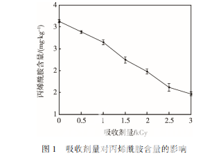 輻照消解油炸土豆片中丙烯酰胺是利用 60Co 衰 變產(chǎn)生的 γ 射線處理淀粉類熱加工食品,通過輻照過 程中基質(zhì)水分產(chǎn)生的自由基誘導(dǎo)丙烯酰胺發(fā)生聚合 反應(yīng)生成無毒的聚合物,從而達(dá)到消除基質(zhì)中已生成 丙烯酰胺的目的。吸收劑量和基質(zhì)含水量對丙烯酰胺 的輻照消解效應(yīng)影響較為顯著,Na2CO3、異抗壞血酸 鈉、芝麻酚可促進(jìn)丙烯酰胺的輻照消解,添加芝麻酚 后丙烯酰胺的消解率最高為 60.49%。此研究從增加 丙烯酰胺分子量的角度考慮,使用較為成熟的輻照技 術(shù)聚合消除已生成的丙烯酰胺,不僅對食品風(fēng)味無影 響且成本較低,是對淀粉類熱加工食品中丙烯酰胺控 制方法體系的補充,可為淀粉類農(nóng)產(chǎn)品熱加工后控制 丙烯酰胺的含量提供理論基礎(chǔ)。