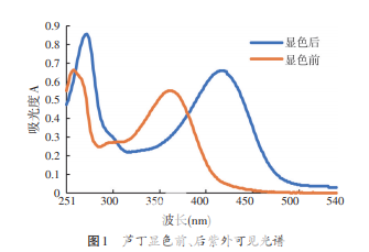 黃酮類化合物經(jīng) AlCl3顯色后,與鋁離子形成穩(wěn) 定的絡(luò)合物,苯甲酰基部分引起的吸收帶(300~ 400 nm)紅移,吸光度明顯增大且專屬性提高。蘆丁 經(jīng) AlCl3顯色后,其 365 nm 處吸收峰紅移至 416 nm, 且吸光度有所增加,見圖1。