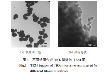為考察鈦源種類對合成 TiO2 微球的影響,分別選 取鈦酸四丁酯和異丙醇鈦作為鈦源,在其他制備條件 不變的情況下合成 TiO2 微球,鈦酸四丁酯和異丙醇鈦 的加入量均為 3.35 mL。圖 1 是以 2 種鈦源為原料合成 TiO2微球的透射電鏡圖片。
