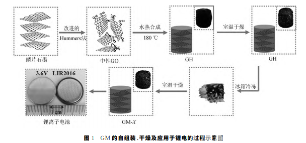 GM-X 自組裝、干燥及應用于鋰電的過程如圖1所 示.采 用 改 進 的 Hummers法制 備 出 中 性 GO溶液作為原料,然后180 ℃下采用水熱反應將其合成為石墨烯水凝膠 GH,經室溫干燥一段時間后,將 其送入冰箱中冷凍處理48h后再在室溫下放置至完全干燥,得到樣品 GM-X,將其應用于鋰離子電池 的負極材料研究中。